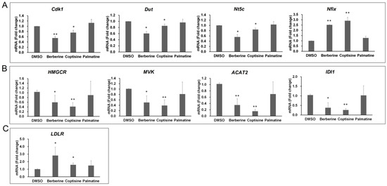 qRT-PCR analysis of genes involved in different biological processes. (A) qRT-PCR analysis of genes related to the cell cycle in RAW264.7 cells after exposure to berberine, coptisine, and palmatine for 24 h. (B) qRT-PCR analysis of genes related to the MVA pathway in HepG2 cells after exposure to berberine, coptisine, and palmatine for 24 h. (C) qRT-PCR analysis of LDLR in HepG2 cells after exposure to berberine, coptisine, and palmatine for 24 h. Data are given as the mean ± SD (n = 3). * p < 0.05, ** p < 0.01 vs. DMSO group.