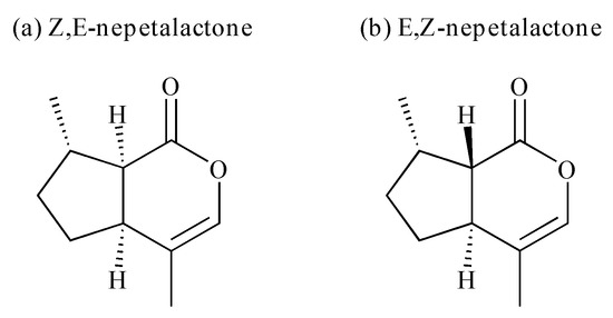 - Peterson, C.J.; Coats, J.R. Catnip Essential Oil and Its Nepetalactone Isomers as Repellents for Mosquitoes. In Recent Developments in Invertebrate Repellents; ACS Symposium Series; American Chemical Society: Washington, DC, USA, 2011; Volume 1090, pp. 59–65. ISBN 978-0-8412-2675-3. [Google Scholar]
