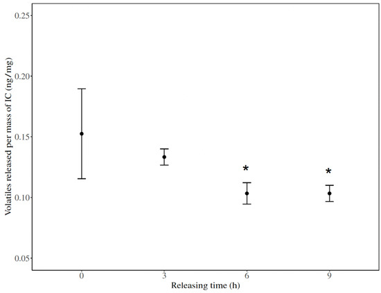 Release of catnip oil volatiles from [catnip: β-CD] inclusion complex (IC) over time. Volatiles measured by SPME/GC-MS (n = 3, * p < 0.05). Error bars represent the standard error for each time measured. Quantification of volatiles released was performed by using the standard curves of catnip oil in hexane. Asterisks indicate data points that are significantly different from time 0.