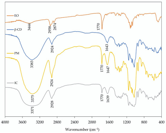 FT-IR spectra of catnip essential oil (EO), β-cyclodextrin (β-CD), their physical mixture (PM), and their inclusion complexes (IC).