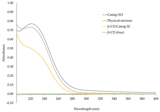 The UV-Vis analysis of the catnip essential oil, [catnip:β-CD] inclusion complex, and the physical mixture of the essential oil and β-CD showed that catnip oil has a maximum absorbance at 220 nm; β-CD has no absorbance peaks in the measured range. The absorbance peak from the catnip oil decreased in the inclusion complex relative to both the physical mixture and the essential oil alone (Figure 4). This is the opposite of what was observed by Canbolat et al. [14] and may indicate a reduced solubility of the encapsulated oil as opposed to an increased solubility. It is also considered that this may be from the encapsulated oil being able to absorb less light while part of the inclusion complex.