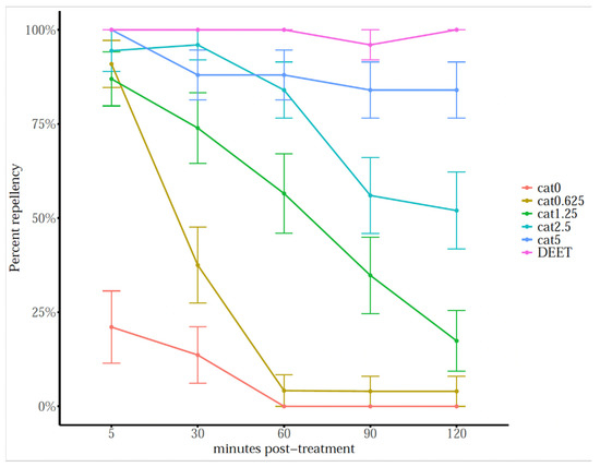 Mean percentage (±SEM) of ticks repelled by catnip essential oil at different concentrations and by DEET (25% v/v) in horizontal filter paper bioassays at different time points. n = 25 per concentration.