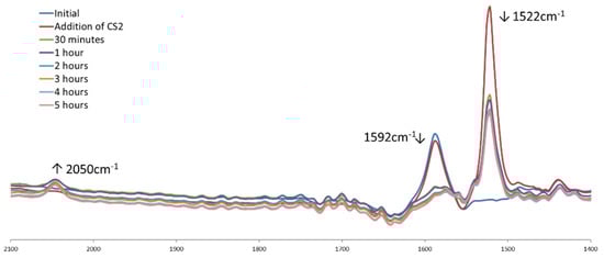 ReactIR monitoring of the reaction between tetrabutylammonium acetate and CS2 in acetonitrile solution. The changes in the IR spectra over time show the loss of acetate (1592 cm−1) and CS2 (1522 cm−1) along with the production of COS (2050 cm−1).
