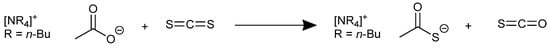 We began by studying the reaction between solid tetrabutylammonium acetate, ([n-Bu4N][CH3COO]), and CS2 gas (Scheme 2). The adduct expected to form, [CH3COOCS2], was not one of the observed products. However, the powdered solid did react rapidly with CS2 vapor in a reaction that could have formed the CS2 adduct as an undetected intermediate. The reaction mixture turned red initially and then after several hours turned yellow. The resulting sticky material could be recrystallized in modest yield. Infrared studies of the atmosphere over the solid showed that COS gas was being formed, as indicated by characteristic adsorption bands observed at 2071 and 2053 cm−1 (Figure S1). These peaks appeared upon the addition of CS2 and grew in intensity as the reaction progressed.