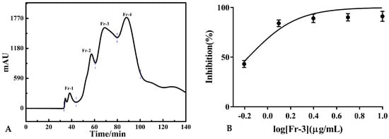 Pretreatment chromatogram of ethanol extract of P. hookeri with MCI medium-pressure chromatographic tower (A); The dose-response curves and IC50 value of Fr-3 (B).