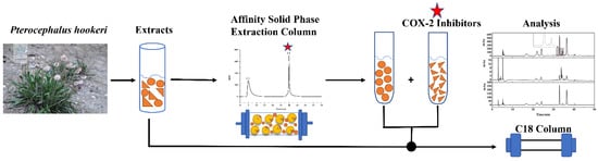 - Zhu, Y.H.; Wang, W.D.; Liu, Z.G.; Jiang, S.R.; Tao, Y.D.; Jiang, L.; Mei, L.J. Comprehensive screening and separation of cyclooxygenase-2 inhibitors from Pterocephalus hookeri by affinity solid-phase extraction coupled with preparative high-performance liquid chromatography. J. Chromatogr. B 2021, 1183, 122981. [Google Scholar] [CrossRef] [PubMed]