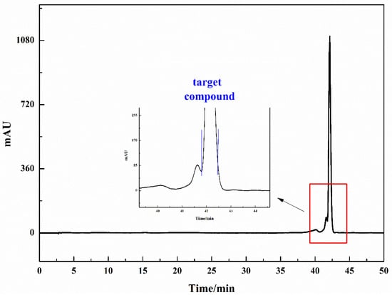 The purpose of the enrichment step was to concentrate the target compounds and make them become the main compound in this fraction. The next step was to prepare the active compound with high purity. In order to efficiently purify the target compound, Fr-t was prepared using the Phecda C18 column, and the preparative chromatogram is shown in Figure 6. This RPLC/RPLC approach is suited to separating nonpolar, polar and ionic compounds from natural products. Additionally, when the sample contained less than ten weakly retained compounds, isocratic separation had a higher separation degree and feasibility compared to gradient separation []. The gradient experiment result could be used to predict the isocratic retention of certain compound at a constant mobile phase composition. In order to efficiently purify the target compound, isometric elution condition (0–50.00 min, 23% ACN) was used, and the mobile phase was composed of 0.2% v/v formic acid/water and ACN.