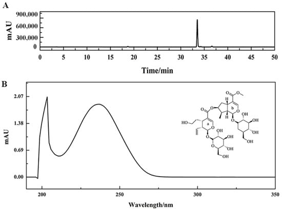 Finally, 765.66 mg of active compound with a purity higher than 95% was isolated. Its purity test diagram and ultraviolet-visible spectroscopy are shown in Figure 7A,B, respectively. This potential COX-2 inhibitor was determined as sylvestroside I by comparing NMR spectral data with published literature.