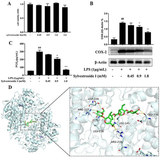 The cytotoxicity assay was conducted to measure the viability of RAW 264.7 cells with sylvestroside I (0.45–3.6 mM) for 24 h (A). The expression of COX-2 (B) and the PGE2 levels (C) was detected with the treatment of sylvestroside I (0.45–1.8 mM) in LPS-induced RAW 264.7 cells for 24 h. The results were expressed as mean ± SD (n = 3), ## p < 0.01 compared with the Con group; * p < 0.05, ** p < 0.01 compared with the LPS group. Docking model of sylvestroside I in COX-2 active site (D).
