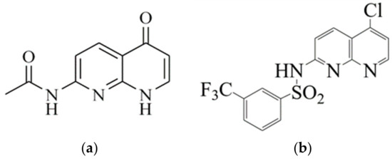 - Everson da Silva, L.; Carlos Joussef, A.; Kramer Pacheco, L.; Bibas Legat Albino, D.; Mauricio Camilo Duarte, A.; Steindel, M.; Andrade Rebelo, R. Synthesis and antiparasitic activity against Trypanosoma cruzi and Leishmania amazonensis of chlorinated 1,7- and 1,8-naphthyridines. Lett. Drug Des. Discov. 2007, 4, 154–159. [Google Scholar] [CrossRef]