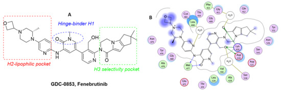In the schematic representation of the different roles of the substituents of GDC-0853, a BTK interaction is reported (Figure 4). The pyridinone core interacts with the hinge region, whereas a piperazino tail and tricyclic nucleus have a specific role in the interaction with H2 and H3 pockets, respectively. GDC-0853 potently inhibits BTK (IC50 = 0.91 nM), suppresses the B-cell- and myeloid cell-mediated components of disease, and demonstrates dose-dependent activity in an in vivo rat model of inflammatory arthritis. In addition, different to previous derivatives, it demonstrates highly favourable safety, PK, and pharmacodynamic (PD) profiles. For these reasons, GDC-0853, under the name Fenebrutinib, is in phase III studies in patients with RA (NCT02983227, NCT02833350), relapsing multiple sclerosis (RMS) (NCT04586023, NCT04586010), primary progressive MS (NCT04544449), severe active SLE (NCT02908100), and chronic spontaneous urticaria (NCT03693625, NCT03137069) [63].