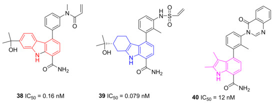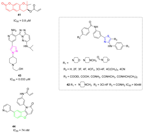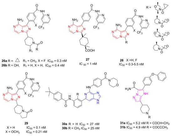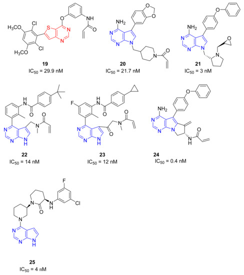 GNE-431 (Table 3), endowed with different heterocyclic moieties, is a very promising molecule, being able to inhibit C481R, T474I, and T474Ms mutants. It represents the first example of a “pan-BTK” inhibitor [49,50].