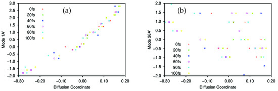 The motion of the wavepacket is even clearer when considering Figures S1 and S2 in the Supplementary Materials, where the data in Figure 1a,b, respectively, are represented in a form where each sample time is allocated its own plot. In Figure S1 we see that, at 0 fs, the wavepacket is sampled at normal mode coordinates between −0.5 and 2.5, whilst after 20 fs the sampled points are located between −0.5 and 3.0. After this time the sampled points begin to be found with normal mode coordinates as low as −2.0 (diffusion coordinate slightly greater than −0.3) indicating motion across the potential barrier, along mode 1A’, as expected. Looking at Figure S2 we see that the sampled normal mode coordinates do not change greatly over time; the diffusion coordinate changes with time but each of those coordinates corresponds to a similar range of the normal mode coordinates, mainly between −1 and 3 (the only outliers being found at 40 fs where the range extends to a normal mode coordinate of −2), reflecting the lack of correlation between mode 36A’ and the diffusion coordinate.