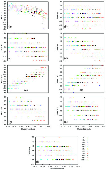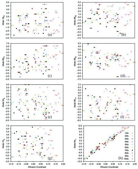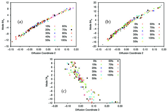 In Figure 3 we plot the normal mode coordinates of the sampled points against the diffusion coordinate , with points coloured according to their sample time. From these nine plots we see that the clear correlation of the 1A’ mode with the diffusion coordinate is weakened; without the sampled points with mode coordinates of less than −0.5 (bottom right of Figure 3a) this would be even less apparent. Of the other modes, the diffusion coordinate has the clearest dependence on 10A’ with weaker dependencies on 11A’ and, even less so, on 9A’ (see Figure 2 in Polyak et al. [67] for diagrams of the vibrational modes), but 10A’ can be characterised as the bending of the oxygen and the carbon bonded to the nitrogen towards one another, whilst 9A’ is a bending of the OH group towards the ring and 11A’ is motion of the oxygen and nitrogen towards one another. The time dependence of the diffusion map can be seen more clearly by considering Figures S3–S11 in the Supplementary Materials, which are versions of Figure 3a–i respectively, decomposed into the individual time samples. In all of these plots we can see clear motion back and forth along the diffusion coordinate as time progresses. Considering both the plots here and in the Supplementary Materials we note that the spread of the sampled points along the respective normal mode coordinates for each value of the diffusion coordinate is similar (about 2 mass-frequency scaled normal mode units) indicating that the wavepacket is fairly well localised during the course of the dynamics. This spread is consistent among both the modes which are relatively well correlated with the diffusion coordinate, and those that are not. Considering the best correlated modes (1A’, 10A’ and 11A’) we see that the overall total magnitude of the motion along these modes, as reflected in the range between the maximum and minimum sampled normal mode coordinates, is largest for these modes (5 units for mode 1A’, 6 for 10A’ and 4 for 11A’), whilst for the less correlated modes the overall magnitude of the motion is less than or equal to 3.5 normal mode units. The spread of the wavepacket makes up a much larger proportion of the overall motion in the less correlated modes, indicating that these modes are less important in the dynamics, although there is clear motion along each of them for the duration of the dynamics (as there is along modes 1A’, 10A’ and 11A’). We thus find that although the 9D salicylaldimine dynamics can be decomposed into a single diffusion coordinate, this is no longer simply related to a single normal mode, but to multiple modes.