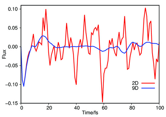 We can further see this by examining the flow of the wavepacket across the transition barrier between the keto and imine tautomers; this can be measured by evaluating the expectation value of a flux operator [6], at every timestep, represented by a surface perpendicular to mode 1A’ located at the peak of the transition barrier. In Figure 4 we plot the expectation value of the flux operator as a function of propagation time for both the 2D (Section 3.1.1) and 9D calculations on salicylaldimine.