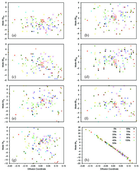The largest (non-trivial) eigenvalues of the diffusion operator were 0.630, 0.364 and 0.286. Following Virshup et al. [52] we note that there is a large drop between the first and second greatest eigenvalues, which indicates that the motion is well-described by the first non-trivial eigenvector. As such, in Figure 1 we present plots of the normal mode coordinates as functions of the associated diffusion coordinate (given by the elements of the eigenvector). Figure 1a gives the plot of the mode 1A’ coordinate against the diffusion coordinate, whilst Figure 1 shows the same plot using mode 36A’ coordinates. Note that different symbols are used for points sampled at different times.