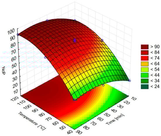To find which tested factors have effect results of extractions, analysis of variance (ANOVA) of the experimental data was performed (see Table 2). The significance of regression coefficients was tested for the F-value and the p-value. According to the determined values, both extraction parameters (time and temperature) can be considered significant in linear and quadratic terms. The interaction between the extraction time and extraction temperature is considered to be insignificant.
