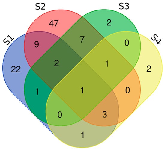 Venn diagram: comparison of the identified compounds in the four fractions obtained using different treatment methods for the areca nut sample.