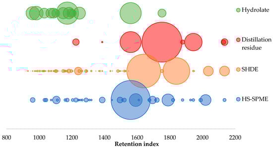 The main differences among the extracts are in the profiles of individual groups of compounds. Figure 3 shows the comparison of the chemical composition of areca nut extracts using bubbles whose sizes correspond to the representation of the individual compounds (the percentage peak area method uses the peak area of the target component as a proportion of the total area of all detected peaks). In terms of the number of compounds identified, the SHDE extract was the richest, as can be seen in Figure 3. In this extract, a broad spectrum of different compounds was identified, most of them terpenes and terpenoids (32 out of 72 identified compounds) with RI ranging from 925 to 1547. Fatty acids have the highest relative amount in all four extracts, concretely 65.51 rel.% in HS-SPME extraction, 85.22 rel.% in SHDE extract, 96.55 rel.% in distillation residue, and 48.53 rel.% in hydrolate. In the case of identified acids, fatty acids with RI were observed ranging from 982 to 2135 in the 4 extracts. Dodecanoic acid was identified in all four extracts. Compounds with RI < 900 were not observed in any extract chromatograms due to solvent cuts during chromatographic analysis. The fewest compounds were identified in the distillation residue. Only eight compounds were detected, and fatty acids (dodecanoic acid and tetradecanoic acid) had the highest relative amounts. In the case of hydrolate, it can be seen in Figure 3 a group of compounds with RI > 900 and <1300 (except for two fatty acids with higher RI), and only very volatile compounds were confirmed. In contrast, there is a wide range of compounds with different RIs in HS-SPME extract.