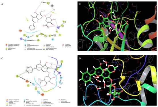 (A) Interaction of oroxylin-A-7-O-Beta-d-Glucuronide with PARP and (B) 3D structure. (C) Interaction of oroxylin-A-7-O-Beta-d-Glucuronide with caspase-3 and (D) 3D structure.