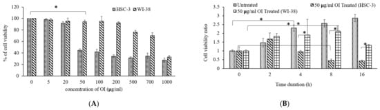 Human oral squamosa cell HSC-3 (JCRB0623) cells were cultured in DMEM with FBS (10%) and 1% anti-bacterial cocktail (Nacalai, Tesque, Inc., Tokyo, Japan) up to sub-confluent stage in 96-well culture plates (Nunc, culture vessel, Thermo Fisher Scientific USA, Pittsburgh, PA, USA) at 37 °C, with a continuous supply of 5% CO2 and with maintenance of 95% humidity. Filter-sterilized (Sartorius Ltd., Göttingen, Germany) OI extract with different concentrations (0, 5, 20, 50, 100, 200, 500, 700 and 1000 ug/mL) were treated to HSC-3 cells at a fixed time of 12 h at standard culture condition. After incubation time, cells were washed twice with cold PBS, and MTT solution was added and incubated further for 4 h for the development of formazan crystals due to stimulation. After incubation time, DMSO solution was added to dissolve the formazan crystal and incubated at room temperature to develop a violet color. Finally, the intracellular purple-colored formazan formation was estimated using a spectrophotometer (λmax = 570 nm), of make Multiskan FC, Thermo Fisher Scientific Inc., Pittsburgh, PA, USA). For time-depended t-cell proliferation assay, the same procedure was employed with a single dose of 50 ug/mL at different incubation periods of 0, 2, 4, 8 and 16 h. Percentage of cell viability was calculated with the following Formula (1).