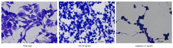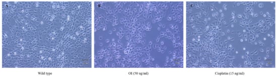 HSC-3 cells were treated with or without OI extract (50 ug/mL) and Cisplatin (15 ng/mL) for a 2 h incubation period in µ-Slide 4-well glass bottom chamber slides (Ibidi, GmbH, Lochhamer, Gräfelfing, Germany) at standard cell culture condition. Following treatment, cells were washed in PBS, fixed in ice-cold 100% methanol, and stained with 0.5% crystal violet (w/v 25% methanol) for 10 min. Cells were intensively washed with Milli Q water, mounted with glycerol and allowed to dry at room temperature. Photographs were taken using a bright-field microscope at 40× magnification (Olympus-1X-73, Olympus Corporation, Tokyo, Japan).