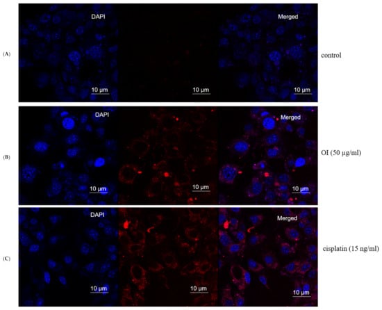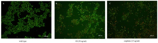 A live/dead cell assay after treatment of HSC-3 cells with the OI extract for 16 h. (A) Wild type: most of the cells showed green fluorescence, denoting viable cells stained with calcein-AM. (B) OI (50 μg/mL)-treated cells showed cytotoxic activity, represented as more red dead cells stained with Ethidium Bromide. (C) Cisplatin (15 ng/mL) treatment also showed more red cells, indicating dead cells due to the cytotoxic activity of cisplatin.