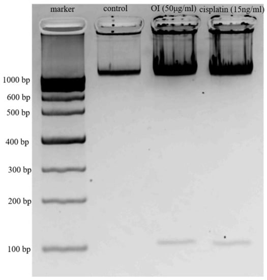 HSC-3 cells were treated with 50 μg/mL of OI, and cells were resolved in 1.0% agarose gels (Figure 5). DNA ladder pattern of fragmentation was observed. These data suggest that Oroxylum indicum is a potent inducer of apoptosis in HSC-3 cells. No bands were observed in the control lane, whereas OI and CP treatment showed two bands indicating DNA breakage phenomena. The upper dark band observed in OI and Cisplatin indicates undigested DNA. The presence of DNA laddering in the OI extract-treated HSC-3 cells compared to the untreated control cells suggests that apoptosis was involved in cell death (Figure 5). Apoptotic cell death is identified by the presence of a specific DNA ladder in cancer cells after anticancer treatment [34,35].