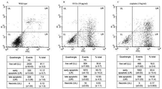 Dot plots of Annexin V-FITC and PI staining to evaluate apoptosis HSC-3 cells following O. indicum treatment. HSC-3 cells were treated with 50 μg/mL OI for 8 h, then incubated with annexin V-FITC and PI, and flow cytometry was used to examine the results. (A) Control—cells that are negative for both PI and annexin V-FITC are shown in the lower-left quadrant. (B) OI extract treatment—annexin positive cells (early apoptotic) in the lower right quadrant, annexin and PI-positive cells in the upper right quadrant (late apoptosis cells). (C) Cisplatin (15 ng/mL) treatment—Annexin positive cells in the lower right quadrant, and annexin and PI-positive cells in the upper right quadrant.