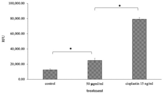 The caspase family members participated in triggering different types of cell death. The amount of fluorescence is directly proportional to caspase-3/7 activity as indicated in Figure 7. Apoptosis is the course of programmed cellular death that manifests disassembling of the intracellular components while avoiding harm and inflammation of surrounding cells [51]. Caspases are involved in the regulation of inflammatory responses and cell death [52]. Caspase-3/7 is an effector caspase engaged in the death of dying cells’ final execution, whereas caspase-9 is an initiator caspase implicated in the intrinsic pathway [53,54].