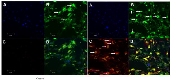 Mitochondrial singlet oxygen stress assay by triple-stain technique—comparing control and OI-treated HSC-3 cells. (A) nuclear stain by DAPI emits blue fluorescence. (B) viable cell by calcein green—the fluorescent calcein molecule is restored, which is trapped in the cell and emits strong green fluorescence. (C) mitostress by SiDMA stain—Si-DMA is able to selectively detect the 1O2 by emitting red fluorescence. (D) merger view shows both green and red fluorescence.