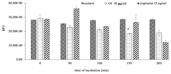 O. indicum extract alleviated mitochondrial membrane potential (MMP). Treatment of HSC-3 cells with OI extract (50 ug/mL) and cisplatin (15 ng/mL) at different incubation periods (0, 50, 100, 150 and 200 min). * p < 0.05 OI treatment v/s control at 150 min of incubation.