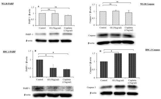 Western blot analysis of the effect of O. indicum extract on the expression of PARP and caspase-3. (A) PARP expression in WI-38 cell lines after 4 h exposure to OI extract. (B) Cleavage of PARP in HSC-3 cells after 4 h exposure to OI extract. (C) Expression of caspase-3 in WI-38 cell lines after 4 h exposure to OI extract. (D) Expression of caspase-3 in HSC-3 cell lines after 4 h exposure to OI. β-actin was used as a loading control. All Western blots are representative of three independent experiments. * p < 0.05, OI and CP v/s control; ns = non-significant changes, OI and CP v/s control.