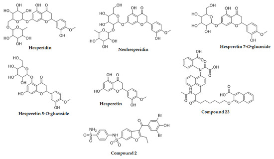 Molecular docking is one of the most frequently used approaches in structure-based drug design because of its ability to predict, with a substantial degree of accuracy, the conformation of small-molecule ligands within the appropriate target binding site. To further understand the mechanisms of action of the flavonoids with inhibitory activity against PTP1B, we performed molecular docking simulations. Specifically, we used AutoDock vina to predict and investigate the interactions between five flavonoids (hesperidin, neohesperidin, hesperetin 7-O-glucoside, hesperetin 5-O-glucoside and hesperetin) and PTP1B, whereas 3-({5-[(N-acetyl-3-{4-[(carboxycarbonyl)(2-carboxyphenyl)amino]-1-naphthyl}-L-alanyl)amino]pentyl}oxy)-2-naphthoic acid (compound 23) and 3-(3,5-dibromo-4-hydroxy-benzoyl)-2-ethyl-benzofuran-6-sulfonic acid (4-sulfamoyl-phenyl)-amide (compound 2), with structures defined in Section 4.4, were considered as the standard ligands for validating the AutoDock vina results (Figure 4).