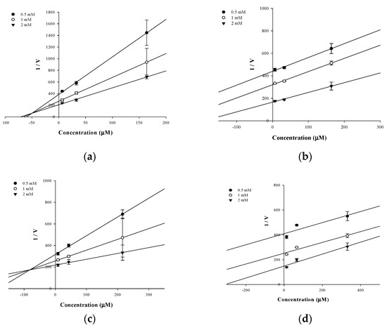 Dixon-plots of the inhibition of PTP1B by the compounds. The results showed the effects of the presence of different concentrations of the substrate (0.5 mM (●), 1 mM (○) and 2 mM (▼) for hesperidin (a), neohesperidin (b), hesperetin 5-O-glucoside (c) and hesperetin (d).