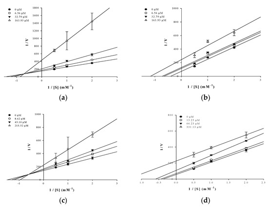 Lineweaver–Burk plots for the inhibition of PTP1B by the flavonoids. The results showed the effects of the presence of different concentrations of the flavonoids (0 μM (●), 6.56 μM (○), 32.79 μM (▼) and 163.93 μM (△) for hesperidin (a) and neohesperidin (b); 0 μM (●), 8.62 μM (○), 43.10 μM (▼) and 215.52 μM (△) hesperetin 5-O-glucoside (c) and 0 μM (●), 13.25 μM (○), 66.23 μM (▼) and 331.13 μM (△) hesperetin (d).