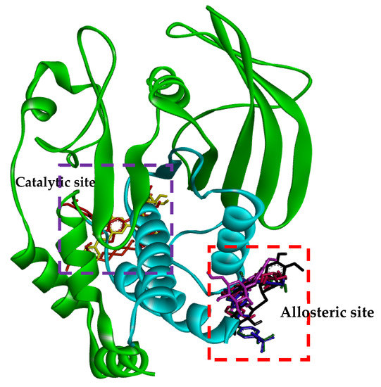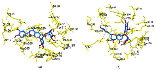 The type of inhibition of the active hesperetin derivatives against PTP1B activity was studied using Lineweaver–Burk plots. Analysis of these plots at different substrate and fixed inhibitor concentrations indicated that hesperidin and hesperetin 5-O-glucoside showed a mixed-type and hesperetin and neohesperidin an uncompetitive-type inhibition mechanism. As observed in Figure 3a,c, hesperidin and hesperetin 5-O-glucoside presented mixed-type inhibition, since the Km value increased while the Vmax decreased. This means that both the inhibitor and substrate can be attached to the enzyme, with the inhibitor attached outside of the active site of PTP1B. In this inhibition type, the enzyme binding activity is affected by the binding of the substrate or inhibitor. This indicates that the inhibitor can bind to both the allosteric site of the free enzyme and the substrate–enzyme complex with similar affinity. After kinetic studies, the binding mode and the type of interactions between the flavonoids and the PTP1B were analyzed by molecular docking studies.