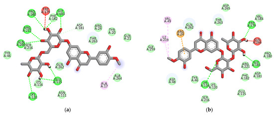 The ligand-enzyme complexes with flavonoids or compound 23 and compound 2 were stably posed in the catalytic and allosteric pockets of PTP1B by AutoDock vina. As illustrated in Figure 5a, hesperidin exhibited −8.4 kcal/mol binding affinity to the catalytic site of PTP1B. Hesperidin binds to PTP1B via the formation of eight hydrogen bonds, as shown in Figure 5a and Table 2. In particular, the hesperidin sugar moieties were observed to form hydrogen bond interactions with the Glu115, Lys120, Arg221, Phe182, Pro180, Gln266, and Gly183 residues of PTP1B. Moreover, the interacting methoxy group formed single alkyl bond interactions with Ala17. Some other interactions like unfavorable donor-donor with Trp179 and carbon-H bonds with Asp181 were observed. As shown in Figure 5b and Table 2, neohesperidin exhibited a binding affinity of −7.7 kcal/mol for PTP1B. Moreover, the neohesperidin sugar moieties formed three hydrogen bonds interactions with Lys116, Gly183, and Trp179. The neohesperidin sugar moiety was observed to form unfavorable donor-donor bond interaction with the Gln266 residue of PTP1B. Alkyl linkages were noticed with Val49 and Ile219 and π-cation linkage with Arg24. The molecular modeling of cognate ligand, compound 23 of protein tyrosine phosphatase 1B showed a network of π-cation and π-alkyl interactions and hydrogen bonding. As shown in Figure 5c, the amino acid residues six involve in hydrogen bonds were Tyr46, Ser216, Ala217, Gly220, Gln262, and Arg221. While π-cation with Gln266, and π-alkyl with Ala217. Moreover, hesperidin also bound to the allosteric site of PTP1B, showing considerable binding affinity (−7.9 kcal/mol) and illustrating two H-bonds with Glu276 and Asn193, with sugar moieties, whereas the hydroxyl and methoxy groups formed two hydrogen bond interactions with Glu200 and Lys197 (Figure 5d). In addition, π-alkyl interaction by Leu192, and unfavorable acceptor-acceptor interactions with Glu276, and π-π stacked with Phe280, and carbon-H bond with Gly277 were noticed. Furthermore, hesperetin 7-O-glucoside formed five hydrogen bonds with PTP1B and exhibited a binding affinity of −8.0 kcal/mol, as shown in Figure 5e and Table 2, respectively. The Asp236 and Ile281 residues were involved in two hydrogen bonds with the hesperetin 7-O-glucoside sugar moieties, whereas the hydroxyl and methoxy groups formed three hydrogen bond interactions with Ala189, Glu200, and Lys197. While carbon-H bond with Gln276 and π-π stacked with Phe280. Moreover, π-alkyl with Phe280 and Leu192 and alkyl linkages with Leu192 were observed (Figure 5e).