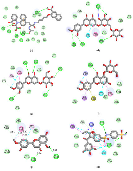 As illustrated in Figure 5f, hesperetin 5-O-glucoside exhibited a −8.3 kcal/mol binding affinity to PTP1B. The Asn193 residue was involved in a hydrogen bond with the hesperetin 5-O-glucoside ketone group, as shown in Table 2. Some amino acids showed π-alkyl interactions like Pro188 and Leu192. Other exhibited π-π stacked interactions with Phe280 and π-anion with Glu276. Additionally, π-sigma interaction was noticed with Ala189 and amide- π-stacked with Pro188. As shown in Figure 5g and Table 2, hesperetin exhibited a binding affinity of −7.6 kcal/mol for PTP1B. The hesperetin interactions of hydroxyl and ketone groups formed two hydrogen bond interactions with Glu200 and Lys197, respectively. Likewise, amino acids responsible for π-alkyl interactions were Phe280 and Leu192 and alkyl linkage with Leu192. In addition, hesperetin showed π-π stacked interaction with Phe280 and carbon-H with Glu276. On the other hand, the Phe280 and Glu276 enzyme residues participated in hydrogen-bonding interactions with compound 2 (Figure 5h). Some other interactions like unfavorable acceptor-acceptor with Leu192 and π-sigma with Phe196 and Leu192 were observed. Compound 2 made π-π stacked interactions with Phe280 and alkyl with Leu192 and π-alkyl linkage with Phe196, Leu192, Ala189 and Phe280. As shown in Figure 5h and Table 2, the binding energies of compound 2 were negative −8.8 kcal/mol, indicating that the additional hydrogen bonding might stabilize the open form of the enzyme and potentiate tighter binding to the PTP1B active site, resulting in more effective PTP1B inhibition. As shown in Figure 6a–h, the 3D interaction diagrams of flavonoids and we observed various van der Waals interactions between flavonoids and PTP1B residues that further stabilized the protein-ligand interaction.