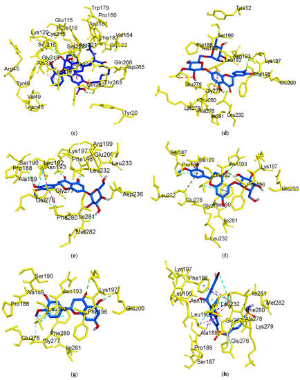 2D molecular docking models of the catalytic site hesperidin (a), neohesperidin (b) and compound 23 (c), and allosteric site hesperidin (d), hesperetin 7-O-glucoside (e), hesperetin 5-O-glucoside (f), hesperetin (g) and compound 2 (h) for PTP1B inhibition.