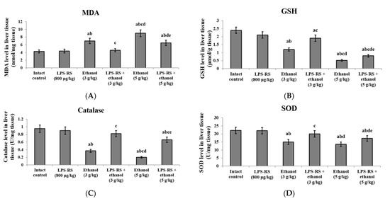 The anti-oxidant effects of LPS-RS (800 μg/kg) in the liver tissue of the experimental rats. Levels of (A) MDA, (B) GSH, (C) catalase, and (D) SOD. MDA, malondialdehyde; GSH, reduced glutathione; SOD, superoxide dismutase. Data are expressed as mean ± SD and analyzed using one-way ANOVA followed by Bonferroni’s post-hoc test (n = 8–10). Differences were considered significantly different at p < 0.05. a vs. intact control; b vs. LPS-RS; c vs. ethanol (3 g/kg); d vs. LPS-RS + ethanol (3 g/kg); e vs. ethanol (5 g/kg).