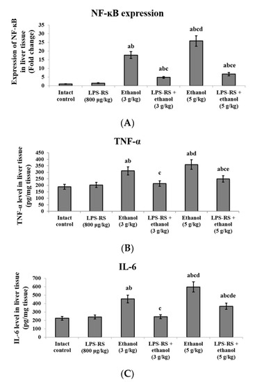 The effect of LPS-RS (800 μg/kg) on inflammatory markers in the liver tissue of the experimental rats. (A) the expression of NF-kB, (B) levels of TNF-α and (C) levels of IL-6. NF-κB, nuclear factor kappa B; TNF-α, tumor necrosis factor-alpha; IL-6, interleukin-6. Data are expressed as mean ± SD and analyzed using one-way ANOVA followed by Bonferroni’s post-hoc test (n = 8–10). Differences were considered significantly different at p < 0.05. a vs. intact control; b vs. LPS-RS; c vs. ethanol (3 g/kg); d vs. LPS-RS + ethanol (3 g/kg); e vs. ethanol (5 g/kg).