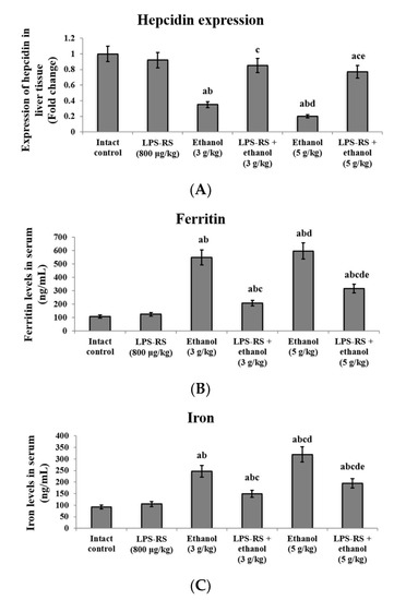 Serum levels of iron and ferritin were also determined. A significant increase in their levels was recorded in both the ethanol administered groups (3 and 5 g/kg) compared to the intact control group, with the levels of iron in the 5 g/kg ethanol group significantly higher than those in the 3 g/kg ethanol group. Serum levels of iron and ferritin were reduced significantly in the two groups that received LPS-RS prior to ethanol (Figure 3B,C) (Figure 3).
