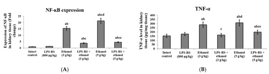 The effect of LPS-RS (800 μg/kg) on inflammatory markers in the kidney tissue of the experimental rats. (A) the expression of NF-kB, and (B) levels of TNF-α. NF-κB, nuclear factor kappa B; TNF-α, tumor necrosis factor-alpha. Data are expressed as mean ± SD and analyzed using one-way ANOVA followed by Bonferroni’s post-hoc test (n = 8–10). Differences were considered significantly different at p < 0.05. a vs. intact control; b vs. LPS-RS; c vs. ethanol (3 g/kg); d vs. LPS-RS + ethanol (3 g/kg); e vs. ethanol (5 g/kg).