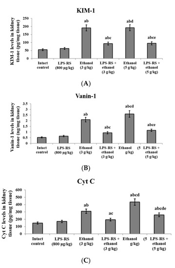 The effect of LPS-RS (800 μg/kg) on the levels of biochemical markers of kidney injury. (A) KIM-1, (B) Vanin-1 and (C) Cyt C in kidney tissue of the experimental rats. KIM-1, kidney injury molecule-1; Vanin-1, vascular non-inflammatory molecule-1; Cyt C, cytochrome C. Data are expressed as mean ± SD and analyzed using one-way ANOVA followed by Bonferroni’s post-hoc test (n = 8–10). Differences were considered significantly different at p < 0.05. a vs. intact control; b vs. LPS-RS; c vs. ethanol (3 g/kg); d vs. LPS-RS + ethanol (3 g/kg); e vs. ethanol (5 g/kg).