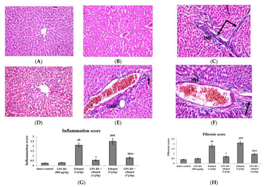 Histopathological sections of rats’ liver stained with hematoxylin and eosin (H&E) (40×). (A) intact control group and (B) LPS-RS group; showing intact superficial layer, normal population and orientation of hepatocytes, (C) rats receiving ethanol (3 g/kg); dilation was observed in the central vein associated with inflammatory cells infiltration (INF) and fibrosis (black arrows) in the portal area, (D) LPS-RS + ethanol (3 g/kg) group; showing almost normal histopathological structure, (E) rats receiving ethanol (5 g/kg); the portal area showed congestion in the portal vein with fibrosis (black arrow) and few inflammatory cells infiltration (INF), diffuse Kupffer cells proliferation as well as diffuse inflammatory cells infiltration (INF) were detected in between the hepatocytes, (F) LPS-RS + ethanol (5 g/kg) group; dilation and congestion were detected in the central veins with few inflammatory cells infiltration (INF) in the portal area, (G) Inflammation score, and (H) fibrosis score. Scores are expressed as mean ± SD and analyzed using one-way ANOVA followed by Bonferroni’s post-hoc test (n = 8–10). Differences were considered significantly different at p < 0.05. a vs. intact control; b vs. LPS-RS; c vs. ethanol (3 g/kg); d vs. LPS-RS + ethanol (3 g/kg); e vs. ethanol (5 g/kg).
