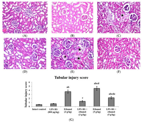 Histopathological sections of rats’ kidney stained with hematoxylin and eosin (H&E) (40×). (A) intact control group and (B) LPS-RS group; showing intact superficial layer, normal population and orientation of nephrocytes, (C) rats receiving ethanol (3 g/kg); showing coagulative necrosis (black star) in the lining epithelium of some individual tubules at the cortex, (D) LPS-RS + ethanol (3 g/kg) group; showing normal histopathological structure in kidney tissue, (E) rats receiving ethanol (5 g/kg); showing coagulative necrosis (black stars) in the lining epithelial cells of some individual tubules, (F) LPS-RS + ethanol (5 g/kg) group; showing almost normal histopathological structure, (G) Tubular injury score. The score is represented as mean ± SD and analyzed using one-way ANOVA followed by Bonferroni’s post-hoc test (n = 8–10). Differences were considered significantly different at p < 0.05. a vs. intact control; b vs. LPS-RS; c vs. ethanol (3 g/kg); d vs. LPS-RS + ethanol (3 g/kg); e vs. ethanol (5 g/kg).