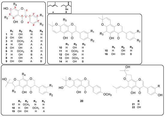 A total of 22 isoflavones were identified as genistein (1), orobol (2), gancaonin A (3), 6,8-diprenylgenistein (4), 6,8-diprenylorobol (5), 5,7-dihydroxy-6-(2″-hydroxy-3″-methylbut-3″-enyl)-4′-methoxylisoflavone (6), isoerysenegalensein E (7), wighteone (8), millewanin H (9), alpinumisoflavone (10), 4′-O-methylalpinumisoflavone (11), 5,3′,4′-trihydroxy-6″,6″-dimethylpyrano-[2″,3″:7,6]isoflavone (12), 3′-hydroxy-4′-O-methylalpinumisoflavone (13), euchrenone b8 (14), derrone (15), 5, 3′,4′, 2‴-tetrahydroxy-2″, 2″-dimethylpyrano-(5″,6″:7,8)-6-(3‴-methyl-3‴-butenyl)isoflavone (16), 4′-O-methylerythrinin C (17), (±)-1″-O-methylerythrinin F (18), furowanin A (19), 4′-O-methyl-2″-hydroxydihydroalpinumisoflavone (20), senegalensin (21), and furowanin B (22) based on previous studies [11,17]. The chemical structures of these 22 isolated isoflavones are shown in Figure 1.