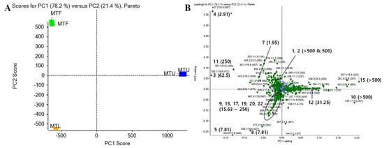 PCA results of extracts of M. tricuspidata leaves (MTL), ripe fruits (MTF), and unripe fruits (MTU). (A) Score plot and (B) loading plot. * Indication (number) of the loading plot is expressed by compound number (MIC value, µg/mL).