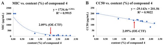 The active compound, 6,8-diprenylgenistein (4), in 15 extracts from BBD was quantified using the quantification method established through method validation (see Supplementary Materials: 2. Quantification of 6,8-diprenlygenistein (4) in OE-MTF). The study of the correlations between the content (%) of 6,8-diprenylgenistein (4) and the antibacterial activity against S. iniae (Figure 3A) and cytotoxicity to FHM cells (Figure 3B) showed that both antibacterial activity and cytotoxicity were highly proportional to the content of 6,8-diprenylgenistein (4), with R2 values of 0.99 and 0.90, respectively. When the content of 6,8-diprenylgenistein was 2% or more, the MIC value remained almost constant, whereas the cytotoxicity increased as the content increased. Therefore, the optimized extraction conditions obtained through BBD resulted in a meaningful outcome that could satisfy both antibacterial activity and cytotoxicity (the content of 6,8-diprenlygenistein (4) was 2.09% in OE-MTF). These results suggest that the antibacterial activity and cytotoxicity of MTF extract are mainly due to the content of 6,8-diprenylgenistein (4). Taken together, these results indicate that the 6,8-diprenylgenistein (4) content of MTF extract can be used for quality control of products.